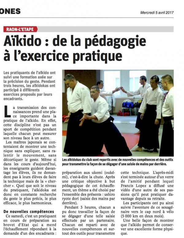 Le 27 février, une vingtaine d'enseignants et futurs enseignants se sont réunis sur le tatami raonnais afin d'échanger et travailler leurs méthodes pédagogiques. Un stage où chacun est reparti avec des pistes nouvelles pour transmettre les techniques autour du thème Ushiro Ryote Dori (saisie des mains par derrière)
